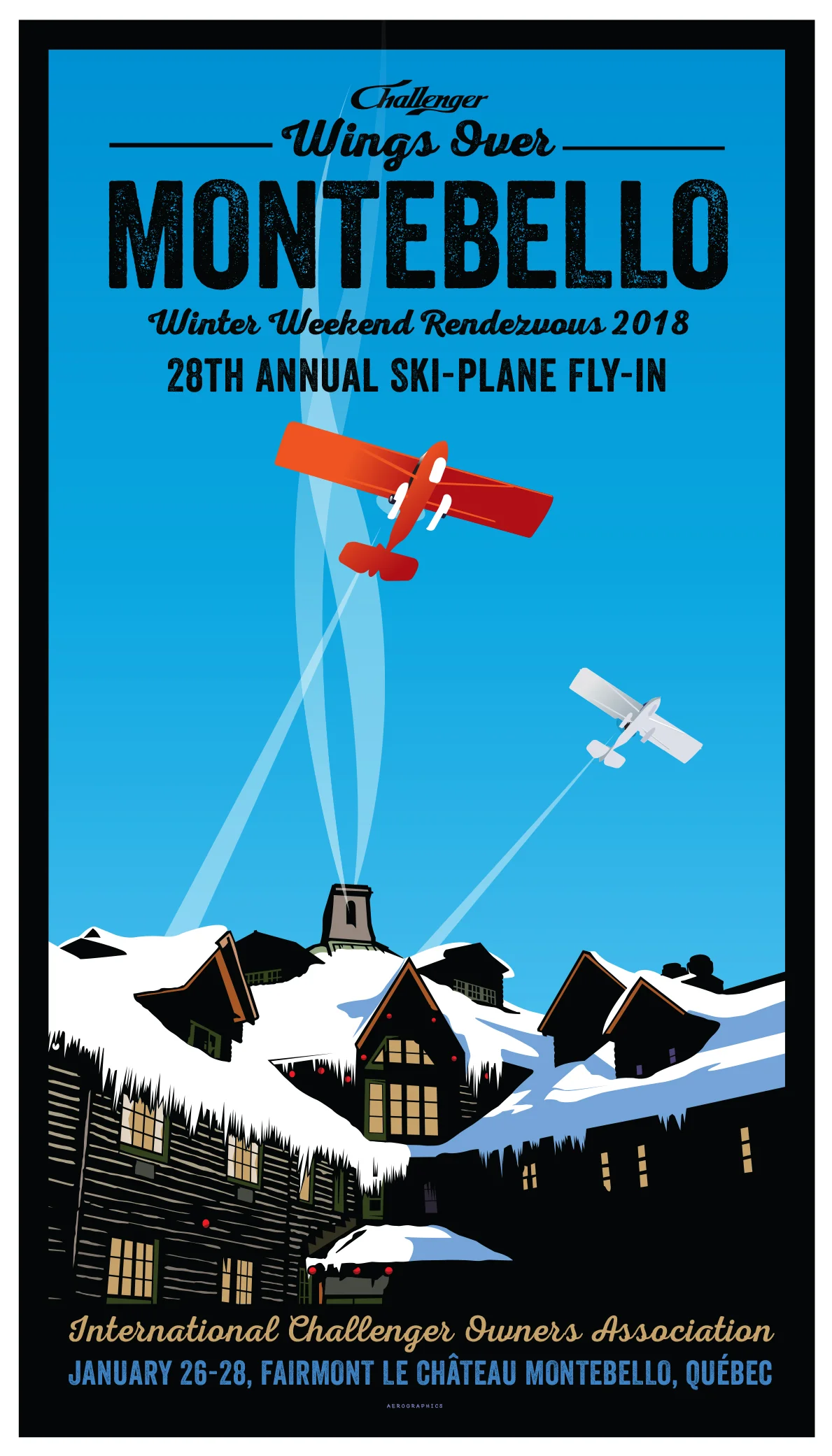 The signature winter flying event for the Canadian Owners and Pilots Association is the ski-plane fly-in on the frozen Ottawa River at the magnificent Fairmont Chateau Montebello—the world’s largest log structure. For the design, we were channeling the beautiful and iconic ski and travel posters from the 1930s to 1950s of the Laurentian ski region of Quebec—sunny skies, breathtaking architecture and plenty of healthy winter activity and clear day flying.